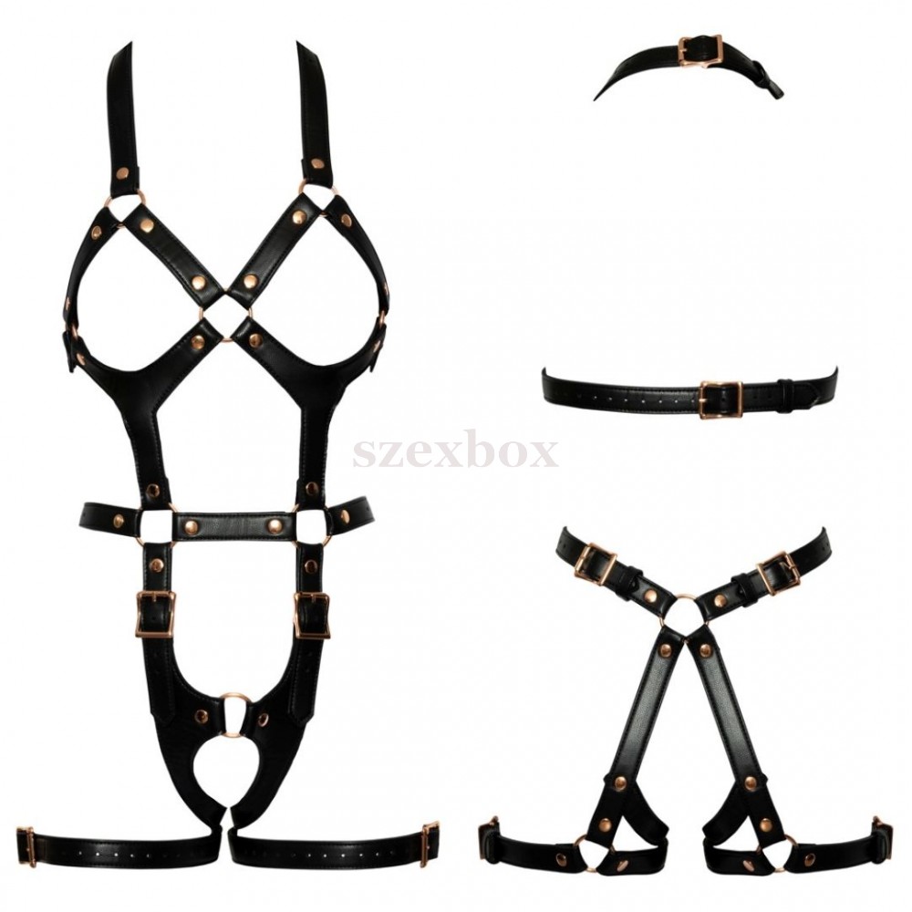Mindent megmutató, szexi, csábító, fekete pántok fém gyűrűkkel, melyek erotikusan emelik ki a keblek, a derék és a fenék vonalát