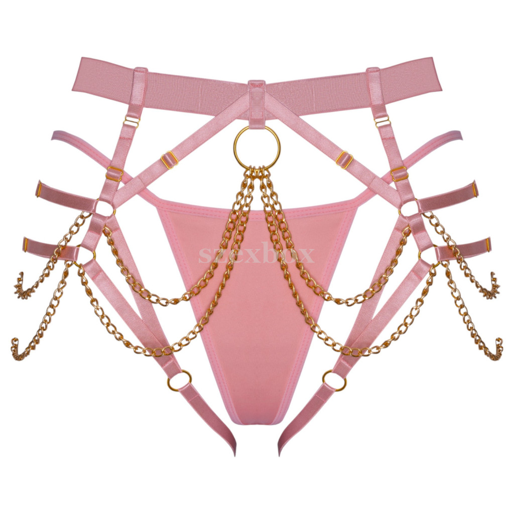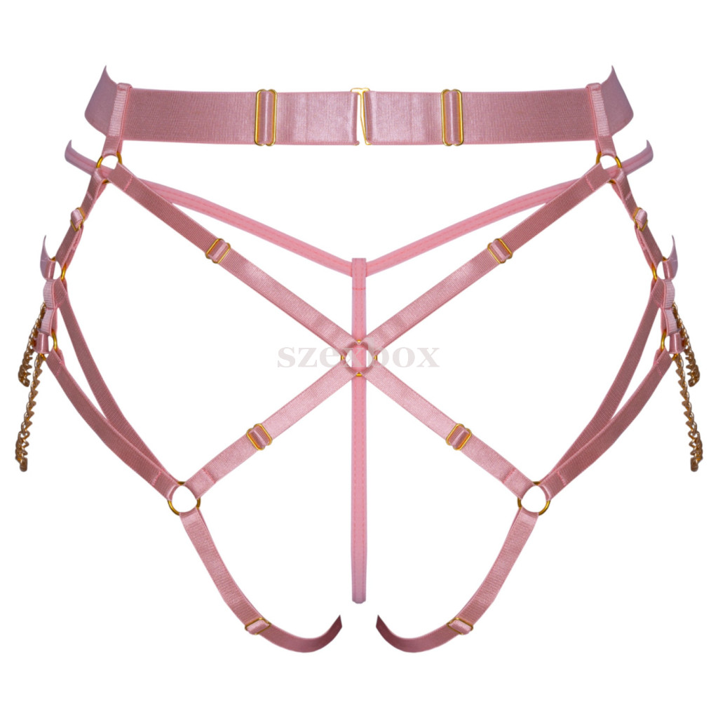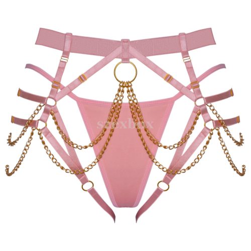 A Bad Kitty láncos hám tangával erotikus fehérnemű tökéletes választás, ha merész, mégis elegáns megjelenésre vágysz. A rózsaszín, enyhén csillogó pántok és az aranyszínű fém kiegészítők glamúros kisugárzást kölcsönöznek. Az elöl és oldalt elhelyezett látványos láncok fokozzák az erotikus hatást, miközben az állítható, rugalmas pántok gondoskodnak a kényelmes viseletről. A szett része egy külön mini tanga is, amely diszkrétebb, mégis szexi alternatívát kínál.