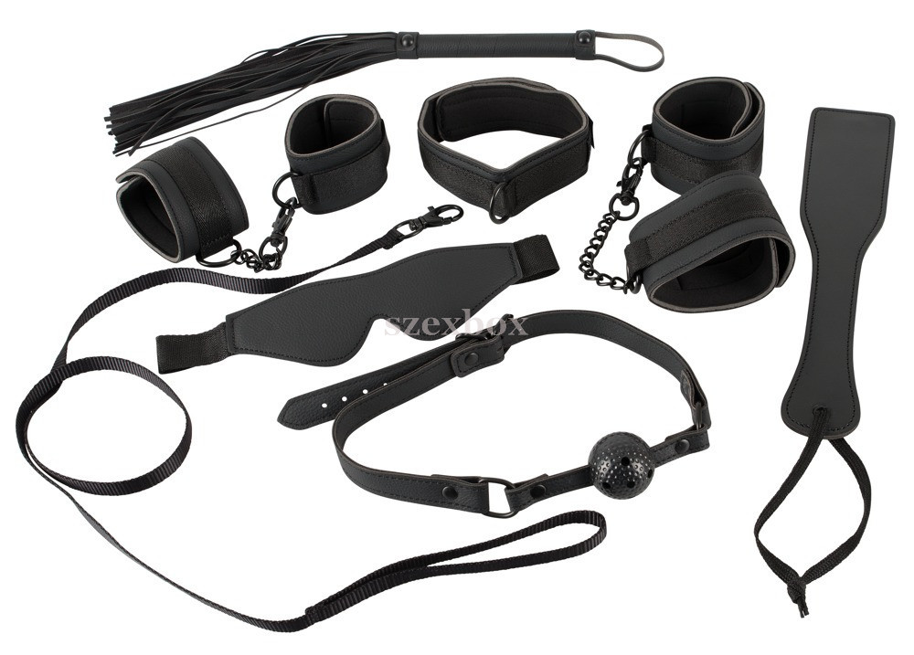 2db csuklóbilincs (kis összekötő lánccal - puha, szivacsos béléssel)2db bokabilincs (rövid összekötő lánccal - puha, szivacsos béléssel)1db nyakpánt (szivacsos, kényelmes béléssel, rögzítőgyűrűvel)1db póráz (csuklópánttal, karabinerrel)1db szemkötő (tépőzáras fejpánttal, puha, szivacsos béléssel)1db szájpecek (lélegzőnyílásokkal)1db korbács (felakasztható kivitelben)1db paskoló (csuklópánttal)