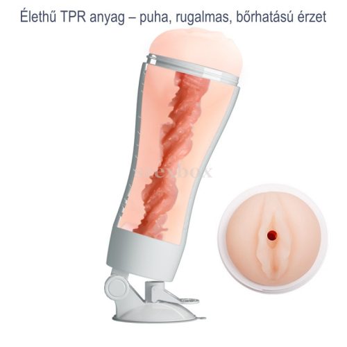 A maszturbátor TPR anyagból készült, amely rugalmas, bőrhatású és könnyen tisztítható. A 15 cm-es behelyezhető hossz ideális a kontrollált, mégis teljes mozgástartományhoz. A masszív tapadókorong sima, nem porózus felületeken stabilan rögzül, így kezek nélkül is használható – akár zuhany alatt is. A squeeze pad mechanikus nyomással fokozza a belső szorítást, így az intenzitás azonnal változtatható. Vízbázisú síkosítóval használva az élmény még természetesebb és komfortosabb.