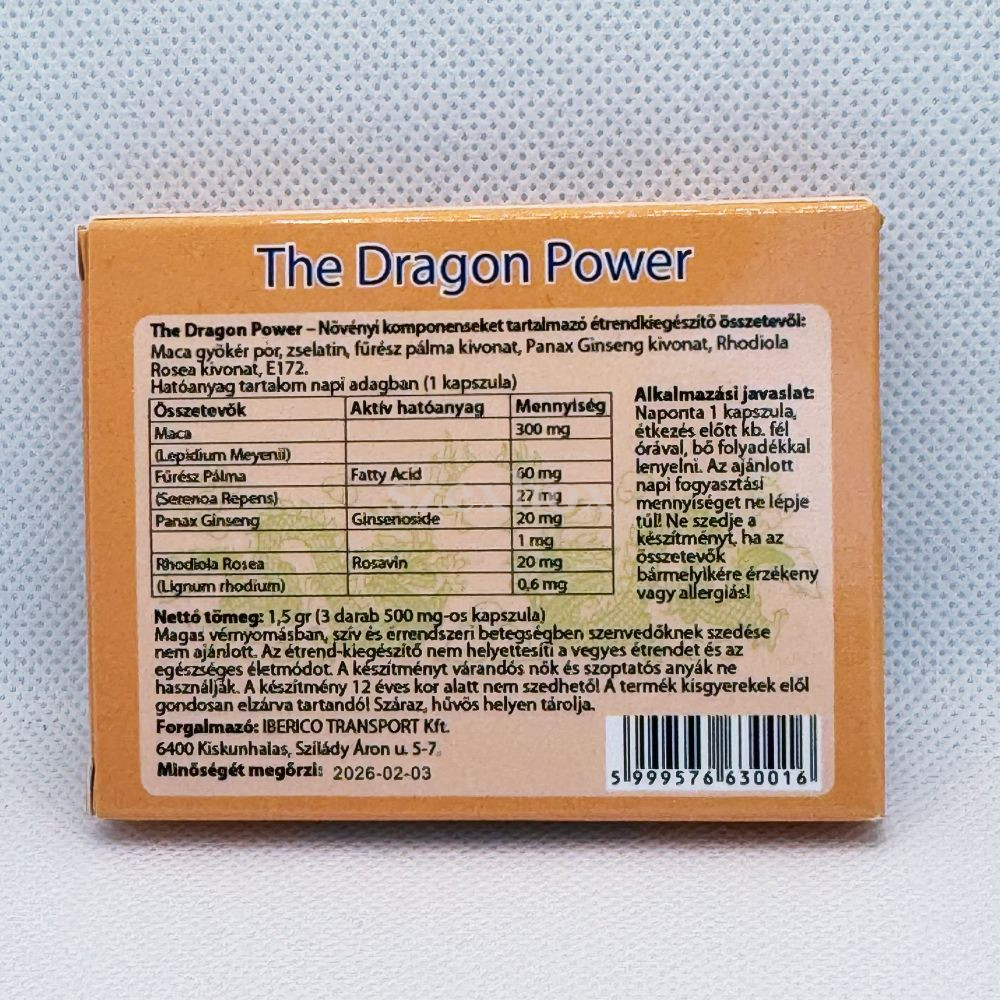 A Dragon Power használatának pozitív hatásai lehetnek:Erőteljesebb erekcióKáros mellékhatásoktól mentesGyors regeneráció az aktusok közöttTöbb napig tartó hatásMérsékelt alkoholfogyasztás esetén is alkalmazhatóMilyen növényi összetevőknek is köszönheti hatékonyságát a merevedési zavar és potencianövelés kezelésében a Dragon Power természetes potencia kapszula?DRAGON POWER a sárkány erejévelAz étrend-kiegészítő összetevői:Maca gyökér por, zselatin, Fűrész Pálma kivonat, Panax Ginseng kivonat, Rhodiola Rosea kivonat, E172.Hatóanyag tartalom napi adagban (1 kapszula):