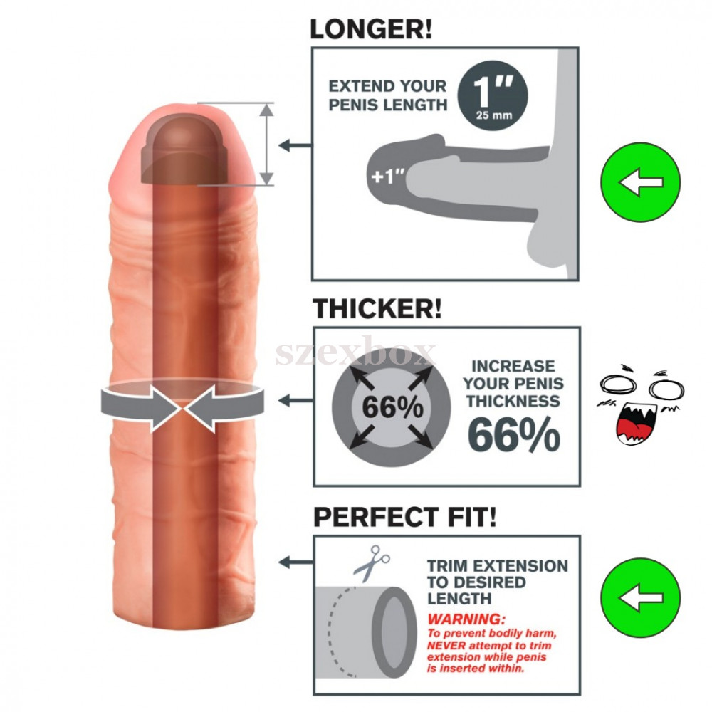 X-TENSION Mega 1 - élethű péniszköpeny (17,7cm) - natúrÉlethű anyagú péniszfeltét, mely fájdalommentesen növeli a pénisz méretét!66%-kal markánsabb átmérő és 2,5cm-re hosszabb hímtag!Miért jó?Valódi érzést nyújtó, tökéletesen élethű anyag és formaRendkívül lágy, selymes tapintású, a valódi bőrre emlékeztetőNagyon rugalmas - tökéletesen idomul szinte minden mérethezRealisztikus pénisz forma - formás, tömör makk és élethű erezésA merev péniszre helyezve hosszabbítja és vastagítja hímvesszőt2,5cm-rel hosszabbít66%-kal vastagít100% vízálló - nem tartalmaz elektromos részeket, teljesen vízálló, könnyen tisztíthatóValódi Pipedream termékHossza éles ollóval méretre vágható! - saját péniszhosszodra szabhatodErre figyelj:minden használat előtt és utána alaposan tisztítsdsíkosításához kizárólag vízbázisú síkosítót használjtároláskor ügyelj arra, hogy ne érintkezzen más termékekkelméretre vágást minden esetben úgy végezd, hogy a pénisz ne legyen benne a termékben!Használat:A köpeny felhelyezése előtt enyhén síkosítsd péniszed és hozd magad izgalmi állapotba, csak ezt követően tudod könnyedén felhelyezni a farkadra. A köpeny külsejét is síkosítsd, hogy könnyebb legyen a behatolás.Belülre ne használj túl sok síkosítót, nehogy lecsúszkáljon!Termék specifikáció, tulajdonságok:élethű, nagyon rugalmas anyagbársonyos, puha tapintásrealisztikus formatömör makk és erezett felszín2,5cm-rel hosszabbít66%-kal vastagítteljes hossz: 17,7cmbehatolási mélység: 15,2cmátmérő: 3cm (rugalmas)max. külső átmérő: 4,8cm (rugalmas)tömeg: 230gszín: natúranyag: TPE (EU-rendeletnek megfelelő, phthalát-mentes)