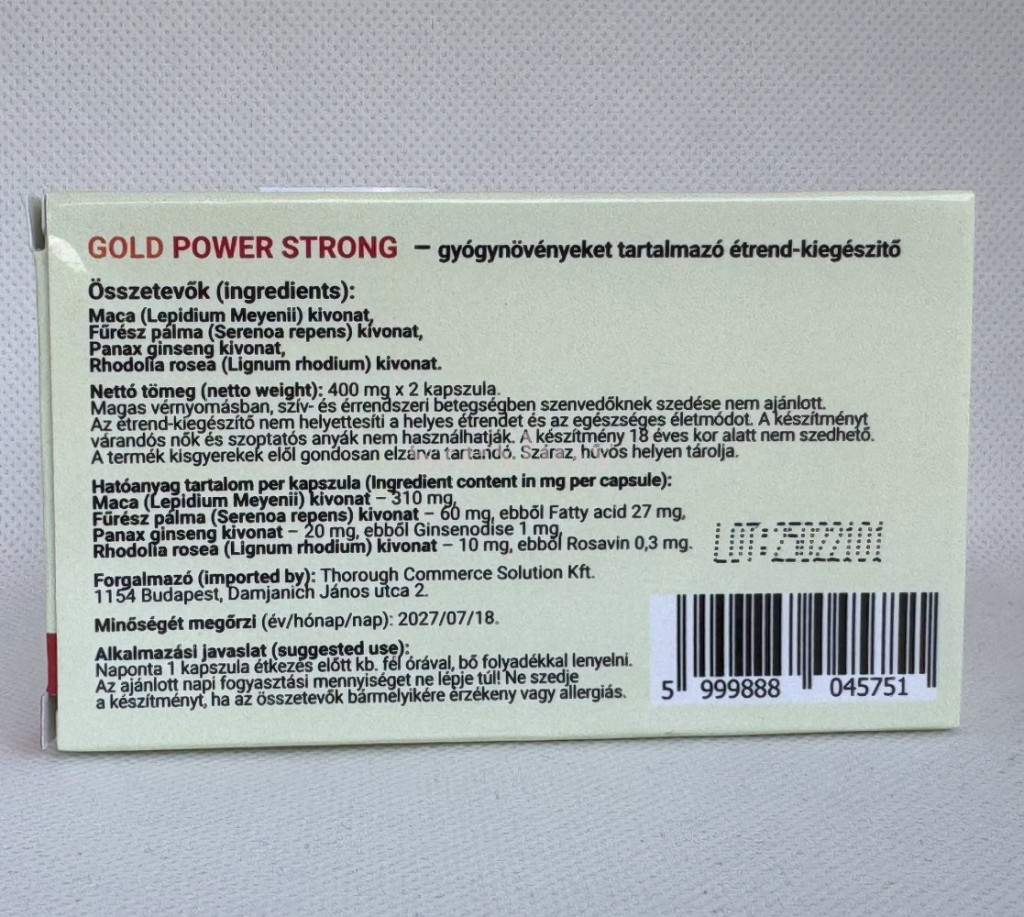 Maca gyökér, Szibériai ginseng és fűrészpálma tartalmú, növényi összetevőket is tartalmazó, étrend-kiegészítő kapszula kifejezetten férfiaknak az egészséges szexuális életmód segítéséhez.Milyen változásokat tapasztalhatsz majd?Növelheti a szexuális étvágyatEnergizálhat, vitalizálhat, javulhat a szexuális állóképességMegakadályozhatja a túl korai magömléstKeményebb lehet az erekcióKitolhatja az aktus hosszátAlkalmazási javaslat:Intim együttlét előtt 25-30 perccel kell bevenni 1 db kapszulát, lehetőleg éhgyomorra egy pohár meleg vízzel, (esetleg meleg tejjel) a legoptimálisabb felszívódás érdekében. Az alkohol fogyasztása kerülendő, mivel alkoholos befolyás alatt, a Gold Power Extra potencianövelő szer nem fejt ki 100%-os hatást. A hatás bekövetkeztének idejében egyéntől függően eltérések lehetnek.Három naponta maximum 1 kapszula bevétele javasolt!Erre figyelj:Az ajánlott fogyasztási mennyiséget ne lépd túl!Ne szedd a készítményt, ha az összetevők bármelyikére érzékeny vagy allergiás vagy!Összetevők Aktív hatóanyagokkal/1kapszula-napi adag:Maca (Lepidium Meyenii) - 310 mgFűrész Pálma (Serenoa Repens) 60 mg / 27 mg Fatty acid Panax ginzeng (sansam) 20 mg / 1 mg Ginsendonise Rhodolia rosea (Lingum rhodium) - 20 mg/0,3mg RosavinNettó tömeg: 1 g (2 db 400 mg-os kapszula)Tárolási javaslat:A terméket kisgyerekek elől gondosan elzárva, száraz, hűvös helyen kell tárolni.Összetevők:Maca gyökér por, Zselatin, Fűrész Pálma kivonat, Panax ginzeng kivonat, RózsagyökérE175FIGYELMEZTETÉS:Magas vérnyomásban, szív és érrendszeri betegségben szenvedőknek szedése nem ajánlott.Az étrend-kiegészítő nem helyettesíti a vegyes étrendet és az egészséges életmódot.A készítményt várandós nők és szoptatós anyák nem használhatják. A készítmény 18 éves kor alatt nem szedhető.