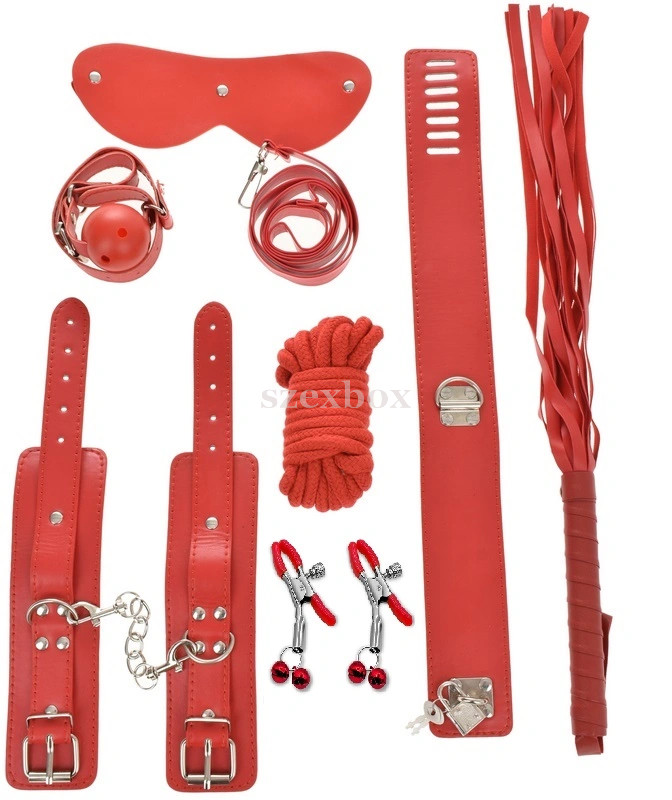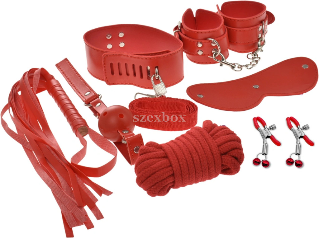 A csomag tartalma:1 pár csuklóbilincs (kis összekötő lánccal)1 darab nyakpánt (állítható, zárható, rögzítőgyűrűvel)1 darab póráz (karabinerrel)1 darab szemkötő (gumírozott fejpánttal)1 darab szájpecek (lélegzőnyílásokkal)1 darab korbács (fonott nyél, csuklószalaggal)1 darab bondage kötél (kb.5 méter)1 pár mellbimbó csipesz (állítható szorítás,piros kis gömbökkel)