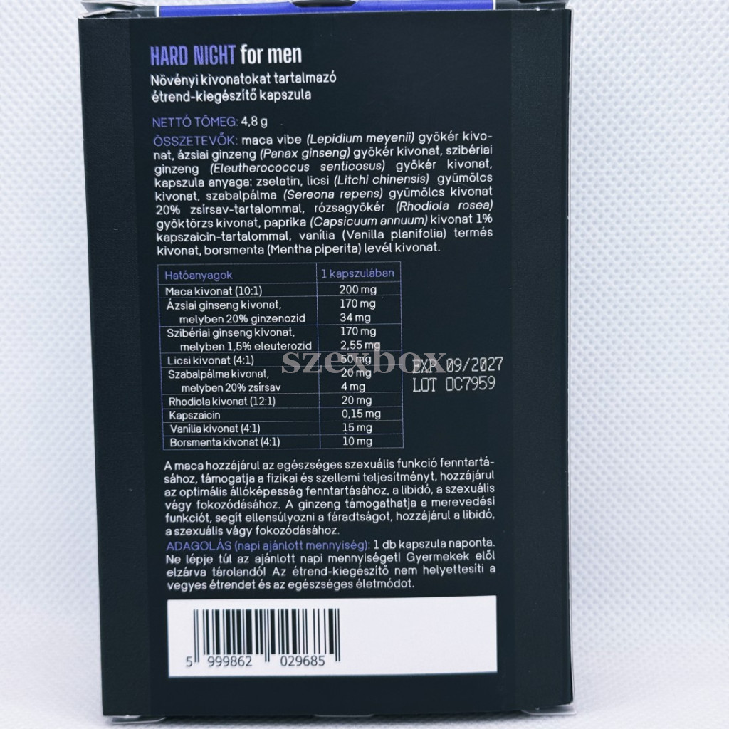 A Hard Night for Men egy gondosan összeállított, természetes eredetű növényi kivonatokat tartalmazó férfi étrend-kiegészítő kapszula. Úgy tervezték, hogy támogassa a szexuális vitalitást, a fizikai és mentális teljesítőképességet, valamint a mindennapi energiaszint fenntartását. Modern megoldás a mai, stresszel teli életmód kihívásaira.