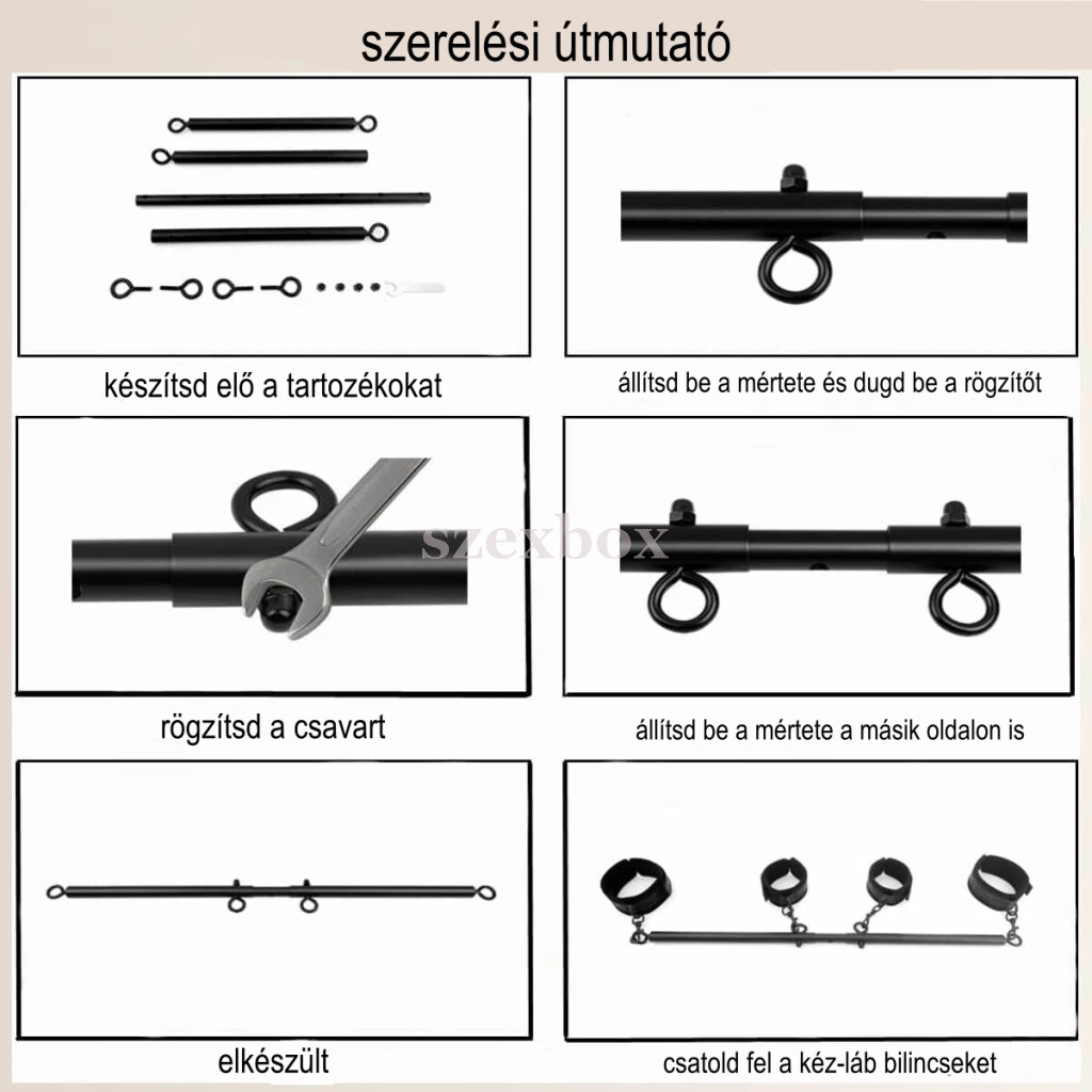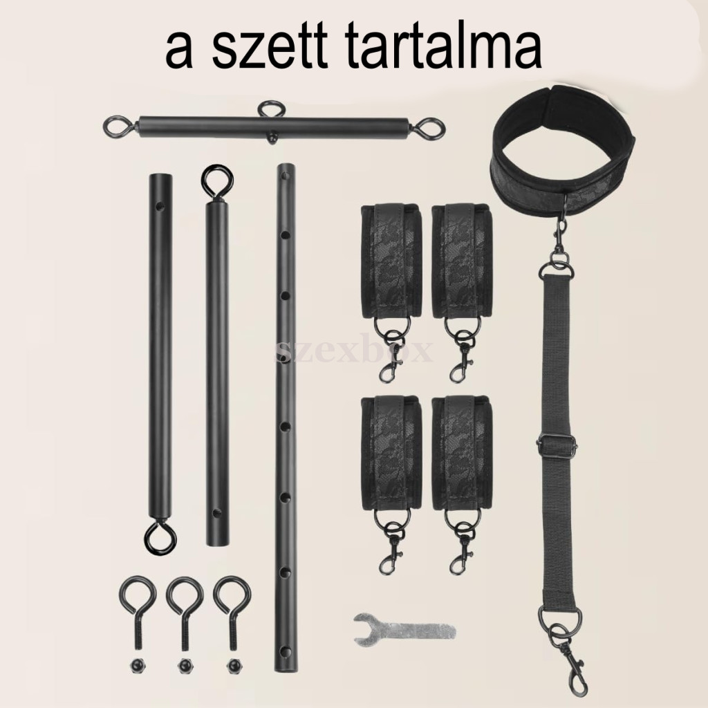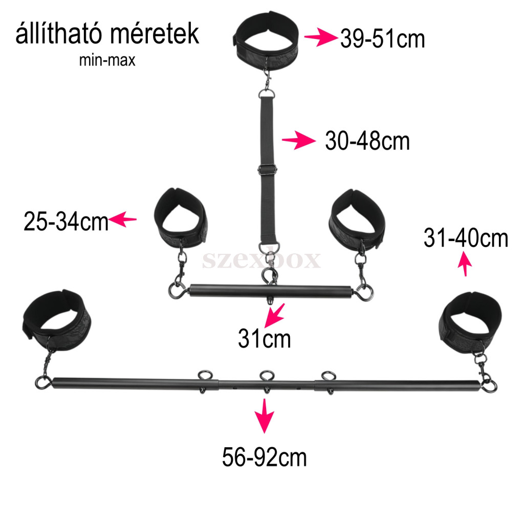 BDSM terpesztő rúd | állítható spreader bar | bilincs szett | BDSM kötöző szett | fém terpesztő rúd | páros BDSM eszköz | bondage szett | nyakpántos bilincs szett | állítható BDSM terpesztő rúd kezdőknek | komplett bondage szett nyakpánttal | kéz és láb rögzítő BDSM szett | puha bilincses fém terpesztő rúd | állítható méretű BDSM bilincs készlet | biztonságos bondage szett pároknak | teljes test kontroll BDSM eszköz | kényelmes bondage szett hosszabb használatra