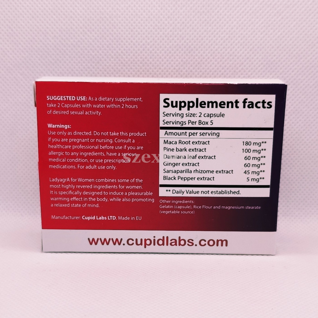 A Ladyagra egy étrend-kiegészítő kapszula, amely többféle növényi kivonatot és aminosavat tartalmaz a női szexuális jólét támogatására. Összetevői – például maca gyökér, damiana, fenyőkéreg kivonat és L-arginin hatásmechanizmusú komponensek – hozzájárulhatnak a vérkeringés és az energiaszint támogatásához. A kapszula 30–60 perccel az együttlét előtt alkalmazva fejti ki hatását, amely egyénenként eltérően alakulhat, jellemzően több órán át tart. A készítmény 10 darab kapszulát tartalmazó kiszerelésben érhető el, alkalmi és kúraszerű használatra is megfelelő. Nem gyógyszer, hanem növényi alapú étrend-kiegészítő.
