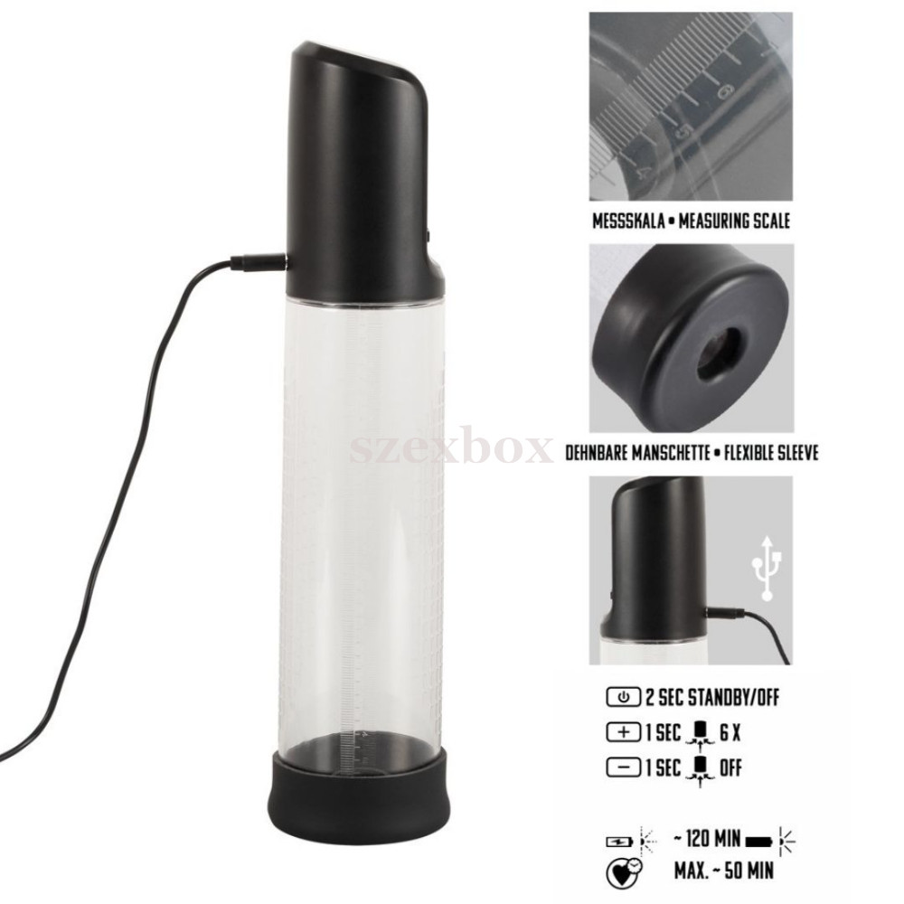 A töltő csatlakozó a plusz-mínusz gombok között került elhelyezésre.Főbb tulajdonságok:-szilárd henger-méretskála-USB-ről tölthető akkumulátor-vákuumképzés és megszüntetés gombnyomásra-4 szívóerősség-egyszerű, 3 gombos vezérlés-nagyon rugalmas mandzsetta-digitális kijelző-mandzsetta belső átmérő: 2cm (nagyon rugalmas)-pumpa teljes hossz: 29,2cm-mélység: 20cm-henger belső átmérő: kb. 5,9cmAnyaga: ABS (henger), PP, Szilikon (mandzsetta) - EU-rendeletnek megfelelő, phthalát-mentes.A termék töltéséhez szükséges USB-kábelt a csomag tartalmazza.Tisztítási javaslat:Langyos, kímélő szappanos vizes tisztítást követően le kell öblíteni és hagyni megszáradni.