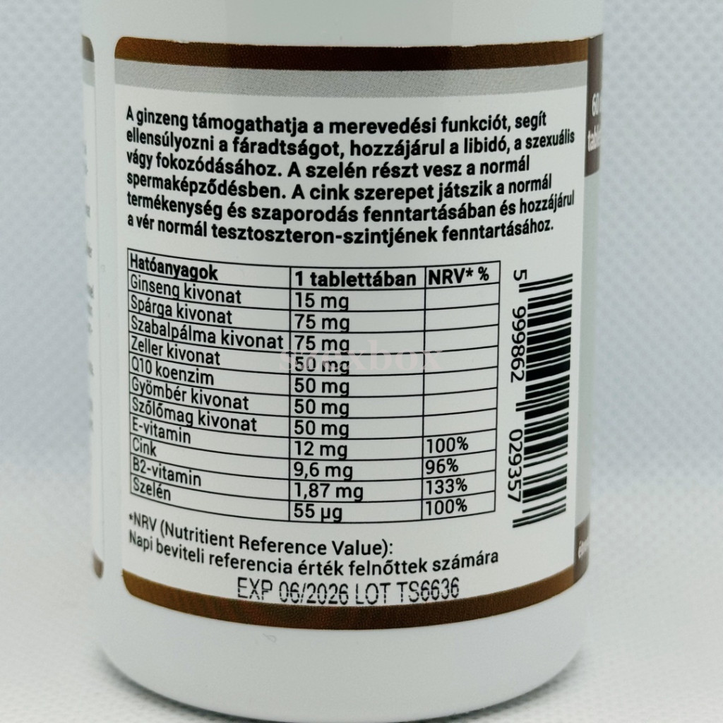 Adagolás:1 naponta 1-2 kapszulaOETI szám 34590/2024Figyelmeztetés:Gyermekek elől elzárva, hűvös, száraz helyen tárolandó! Több órás erekció esetén azonnal forduljon orvoshoz! Ne lépje túl az ajánlott napi mennyiséget! Használat előtt kérje ki orvosa tanácsát! 18 éven aluliak, magas vérnyomásban vagy más betegségben szenvedők ne használják! Az étrend-kiegészítő nem helyettesíti a vegyes étrendet és az egészséges életmódot! Minőségét megőrzi a csomagoláson feltüntetett időpontig.