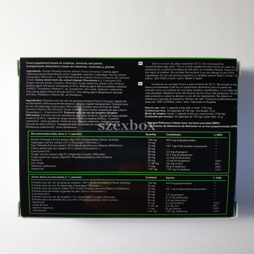 Összetevők:Ginzeng (Panax ginseng), Hólyagmoszat (Fucus vesiculosus), Zeller (Apium graveolens), Közönséges spárga (Asparagus officinalis), Sáfrányos szeklice (Carthamus tinctorius), Fűrészpálma (Saw palmetto), Közönséges gyömbér (Zingiber officinale), Bortermő szőlő (Vitis vinifera), Cink-oxid (Zinc oxide), B2-vitamin (Riboflavin)Hatóanyag a napi adagban (1 kapszula):Ginzeng (Panax ginseng) - 185mgHólyagmoszat (Fucus vesiculosus) - 100mgZeller (Apium graveolens) - 95mgKözönséges spárga (Asparagus officinalis) - 90mgSáfrányos szeklice (Carthamus tinctorius) - 82mgFűrészpálma (Saw palmetto) - 80mgKözönséges gyömbér (Zingiber officinale) - 50mgBortermő szőlő (Vitis vinifera) - 50mgCink-oxid (Zinc oxide) - 9,6mgB2-vitamin (Riboflavin) 1,4mg