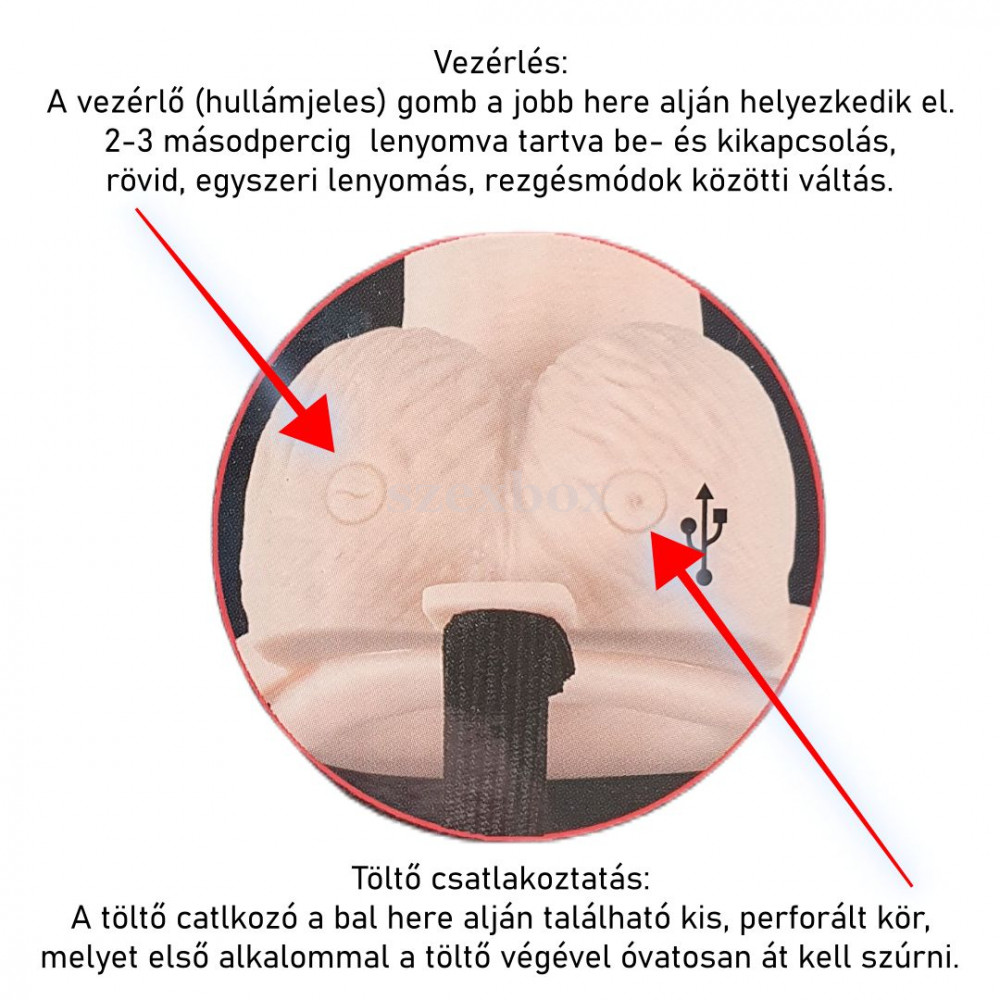 ruganyos, jó tartású anyagélethű pénisz forma, makkal, erezett felszínnel és herékkelüreges belső kialakításbeépített akkumulátortöltési idő: 120 perckészenléti idő: 70-90 perc7 rezgésmódnagyon rugalmas pántok