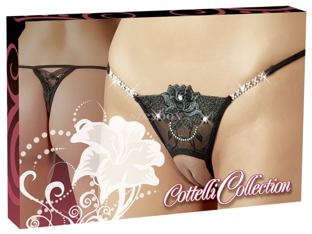 Szeméremnél nyitott tanga, csodálatos fekete, hímzett virág motívumokkal és csillogó strasszokkal gazdagon díszítve. Áttetsző fekete anyagból készült. A virágot apró kövek díszítik. Kétoldalt csillogó, hátul fűzős díszítéssel. Anyaga:100% Polyester.