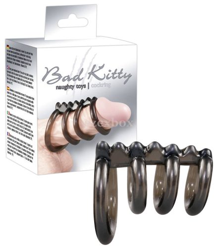 For a stable, strong, long-lasting erection and extra vaginal massage!Made of flexible material with a pleasant feel, four penis rings with a thick wall (0.8cm) to help maintain an erection. Three rings of the same diameter to be placed on the penis and a larger diameter ring that can be fitted either on the penis or around the testicles.As an extra bonus, the four rings are connected by a soft spiked grommet that gently massages the partner during intercourse.Product material: TPE (EU compliant, phthalate-free).Material thickness: 0.8cm.The smaller rings have a diameter of 2.3cm, the larger ring has a diameter of 4.3cm.The total length of the product is 6.5cm.Available in black, smoke colour.