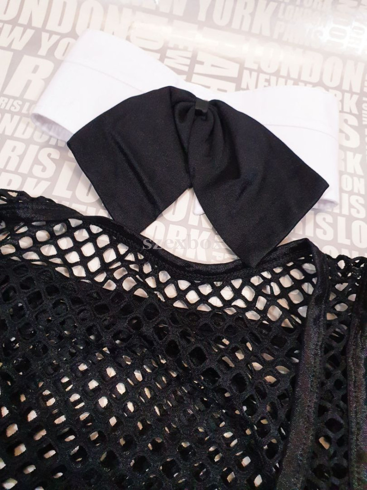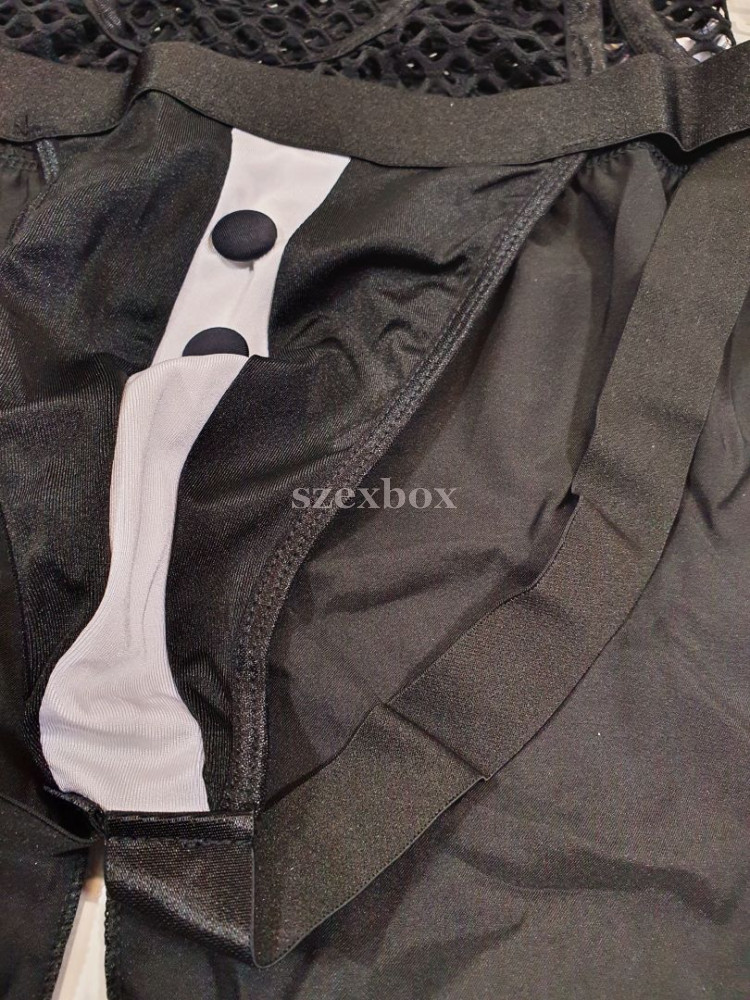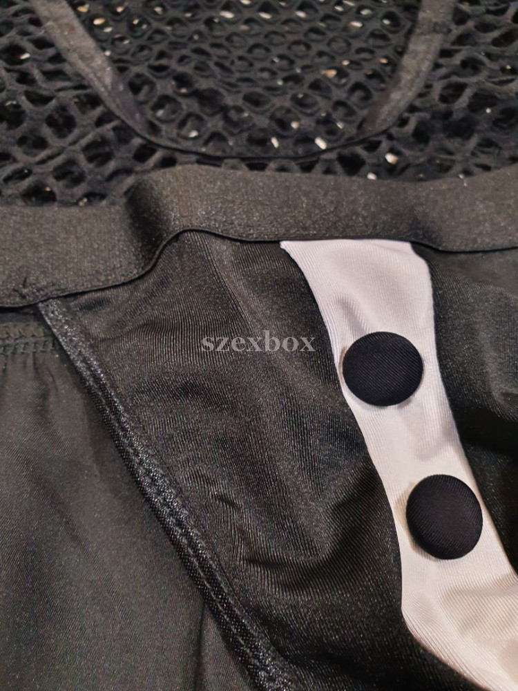 Sexy, exciting black mesh topPerfect for role-playingpatent neckband with detachable tieshiny bottom with comfortable, elastic waistbandbottom with white decorative stripes at front and button trimwith only two straps at back, leaving bottom freebottom trim has a frock-coat look at backmesh white gloves