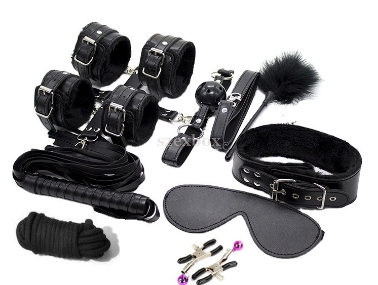 1db stroker with soft feathers, plastic handle1db whip imitation leather with threads, wrist strap2db (1 pair) wrist cuffs with short chain, small carabiner2db (1 pair) ankle cuffs with short chain, with small carabiner1pcs collar + guide bar2pcs (1 pair) nipple clamps with metal screw with adjustable clamp and small purple bell1pcs bondage rope1pcs mouthguard with plastic ball, breathing holes and adjustable headband1pcs blindfold1pcs cross strap with small carabiner