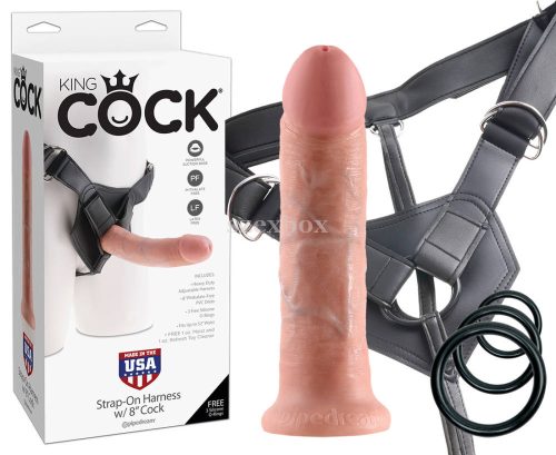 The set includes:Life-like King Cock 8 silicone dildoBlack imitation leather bottom with adjustable straps3 silicone retaining rings with different diameters (3cm, 4cm, 5cm)Features:-excellent tensile strength bottom-with adjustable straps-3pcs silicone fastening rings with adjustable straps with high tensile strength-with metal D-fasteners-removable, can be used separately with dildo-lifelike material-truly realistic penis shape-soft to the touch-realistic erection-shaped glans-dildo length: 20,6cm-dildo diameter: 4,4-4,7cm-natural coloured dildo-black coloured bottomMaterial: metal, Vinyl, Velcro, Silicone (rings), PVC (dildo) - EU compliant, phthalate free.