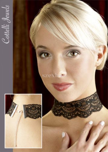The black lace strap is approximately 5cm wide and 30cm long. With a chain at the back so the maximum length is approx. 45cm. 100% Polyester.