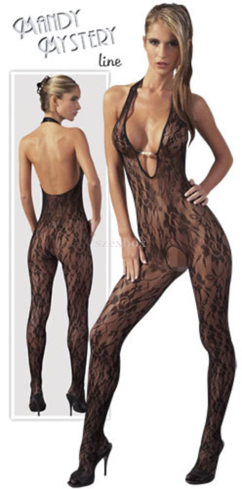 Soft lace from top to toe. Spectacular woven stretch lace overalls with open bodice and deep beaded neckline. Halter neck design with a deep back cut. In black. Size: S/M. Material: 100% Polyamide.