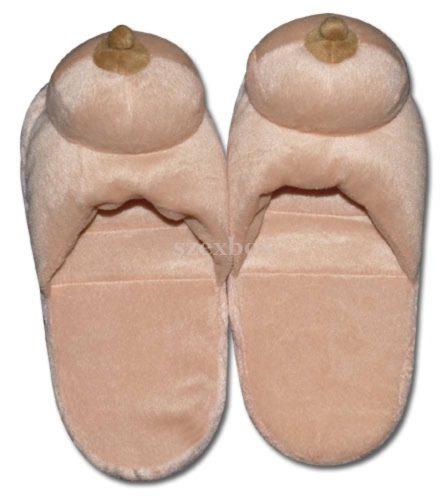 A warming, fun and sexy foot warming slipper for cold days!Very nice, soft, warm plush natural colour slipper (1 pair) with natural coloured round breast and perky nipples.Material: 100% Polyester