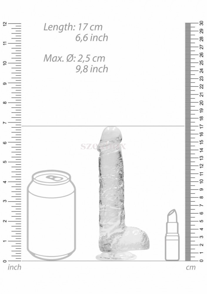 Straight shapeSlightly veined surfaceShaped, sculpted acornRounded testiclesSmaller size, for beginnersPackaging size 25 x 14,90 x 4,70 cmOverall length: 16,5 cmInsertion length: 11,5 cmDiameter: 3,3 cm Suction cup diameter: 4,5 cmSuction cup height: 1,5 cmWaterproofLatex free productColour: translucentMaterial: TPE (EU compliant, phthalate free).