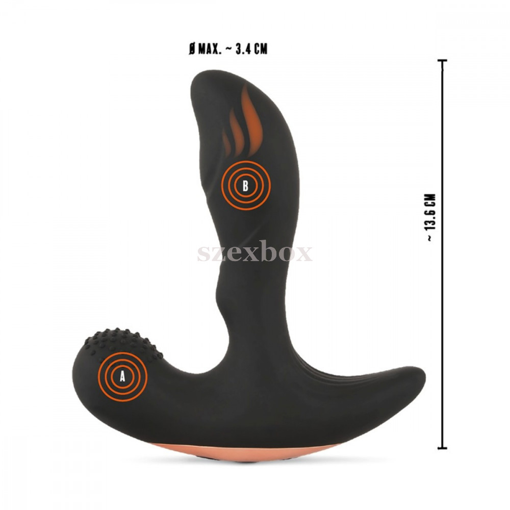 springy, skin-friendly, silicone material2 powerful motorsunisex design11 vibration modesradio remote controlheating function (42°C)built-in USB rechargeable batterytotal length (including base): 13,6cminsertable length (up to base): 10,5cmmax. max. head diameter: 3cmmax. udder diameter: 2cmmax. grip diameter: 3cmgrip length: 5cmcolour: blackweight: 280gmaterial: ABS, Silicone, PU coated (EU compliant, phthalate free)