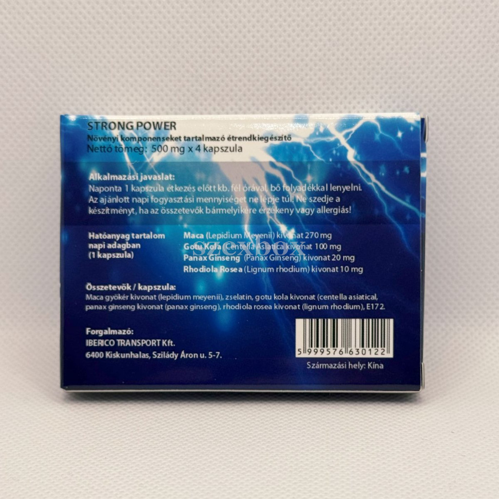Product name: STRONG POWER - male potency enhancement capsulePackaging: 4 capsulesCapsule weight: 500 mgType: Dietary supplementUse: OccasionalRecommended dosage: 1 capsule / 2-3 daysOnset of effect: approx. 30–45 minutesOÉTI notification number: 30266/2022Active ingredients (daily dose: 1 capsule):