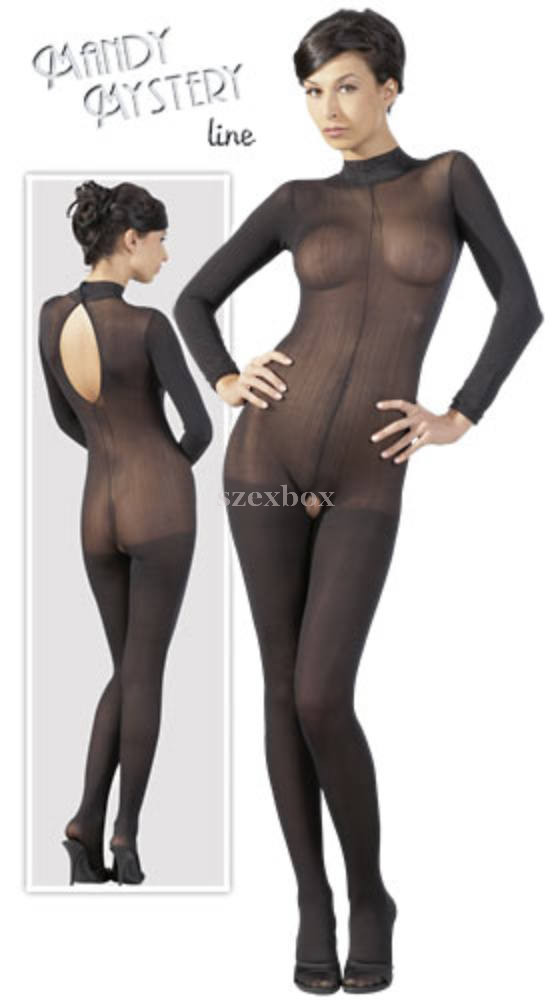 Long-sleeved cat suit in black, slightly sheer fabric with inviting opening at the pubis. Highly closed lace collar and velcro fastening. Full-length with foot. Made of supple, soft, high quality fabric - barely noticeable against the skin. 100% polyamide.