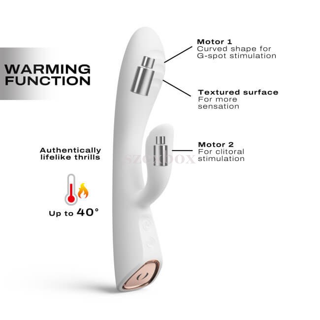 Controls:There are two buttons on the device. A long press on the power button puts the device in standby mode, indicated by the illuminated LED. Repeated short presses to toggle between the vibration modes of the waving arm.The bottom waving button toggles between the vibration modes of the long arm.Long press! The buttons start to glow red and both ends of the vibrator start to heat up gently!Long press the power button to turn the device off permanently.Charging connection:The device can be charged simply by using the magnetic USB cable. The magnetic charging socket is located on the bottom of the pamper, in the middle of the gold-plated two small metal dots.Dorcel Flexi Rabbit rechargeable heated vibrator with tickle lever features: