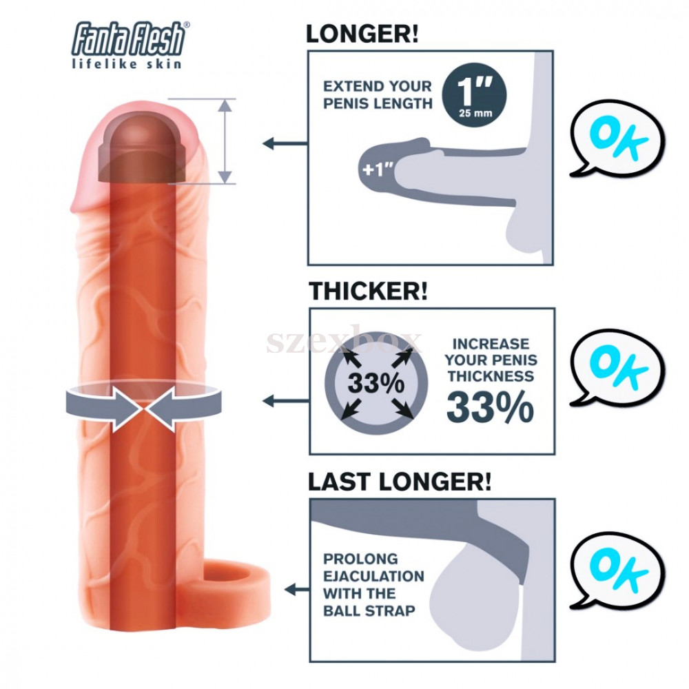 X-TENSION Perfect 1 - heregyűrűs péniszköpeny (17,7cm) - natúrÉlethű anyagú péniszfeltét, biztos tartás adó heregyűrűvel, mely fájdalommentesen növeli a pénisz méretét és nem csúszkál le!33%-kal markánsabb átmérő és 2,5cm-rel hosszabb hímtag!Miért jó?Valódi érzést nyújtó, tökéletesen élethű anyag és formaRendkívül lágy, selymes tapintású, a valódi bőrre emlékeztetőNagyon rugalmas - tökéletesen idomul szinte minden mérethezRealisztikus pénisz forma - formás, tömör makk és élethű erezésA merev péniszre helyezve hosszabbítja és vastagítja hímvesszőt2,5cm-rel hosszabbít33%-kal vastagít100% vízálló - nem tartalmaz elektromos részeket, teljesen vízálló, könnyen tisztíthatóValódi Pipedream termékRugalmas heregyűrű a helyén tartja - nem csúszik le, akár tovább is bírhatod, mielőtt elélveznélErre figyelj:minden használat előtt és utána alaposan tisztítsdsíkosításához kizárólag vízbázisú síkosítót használjtároláskor ügyelj arra, hogy ne érintkezzen más termékekkelHasználat:A köpeny felhelyezése előtt enyhén síkosítsd péniszed és hozd magad izgalmi állapotba, csak ezt követően tudod könnyedén felhelyezni a farkadra. A köpeny külsejét is síkosítsd, hogy könnyebb legyen a behatolás.Belülre ne használj túl sok síkosítót, nehogy lecsúszkáljon!Először a hímtagra helyezd a köpenyt, majd a heréket körül ölelve a gyűrűt.Termék specifikáció, tulajdonságok:élethű, nagyon rugalmas anyagbársonyos, puha tapintásrealisztikus formatömör makk és erezett felszín2,5cm-rel hosszabbít33%-kal vastagítteljes hossz: 17,7cmbehatolási mélység: 15,2cmátmérő: 2,7cm (rugalmas)max. külső átmérő: 4,4cm (rugalmas)tömeg: 175gszín: natúranyag: TPE (EU-rendeletnek megfelelő, phthalát-mentes)