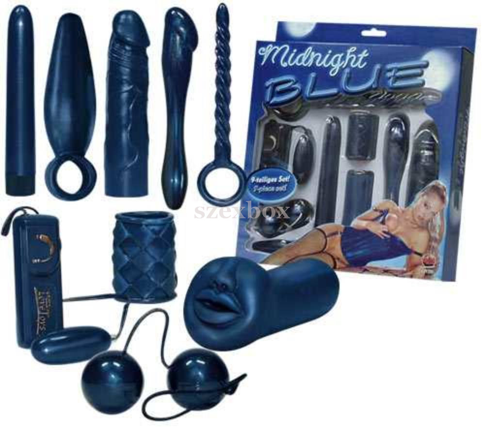 9 részes szex-szett kék, zselés anyagból. A rúdvibrátor mellett (17,5cm hosszú, átmérője 2,5) sok egyéb kiegészítőt, mint kéjgolyókat, vibro-tojást, análizgatókat, maszturbátort, mandzsettát, péniszköpenyt, szilikon análujjat, dildót is megtaláltok a készletben. A szükséges elemeket tartalmaz a csomag...