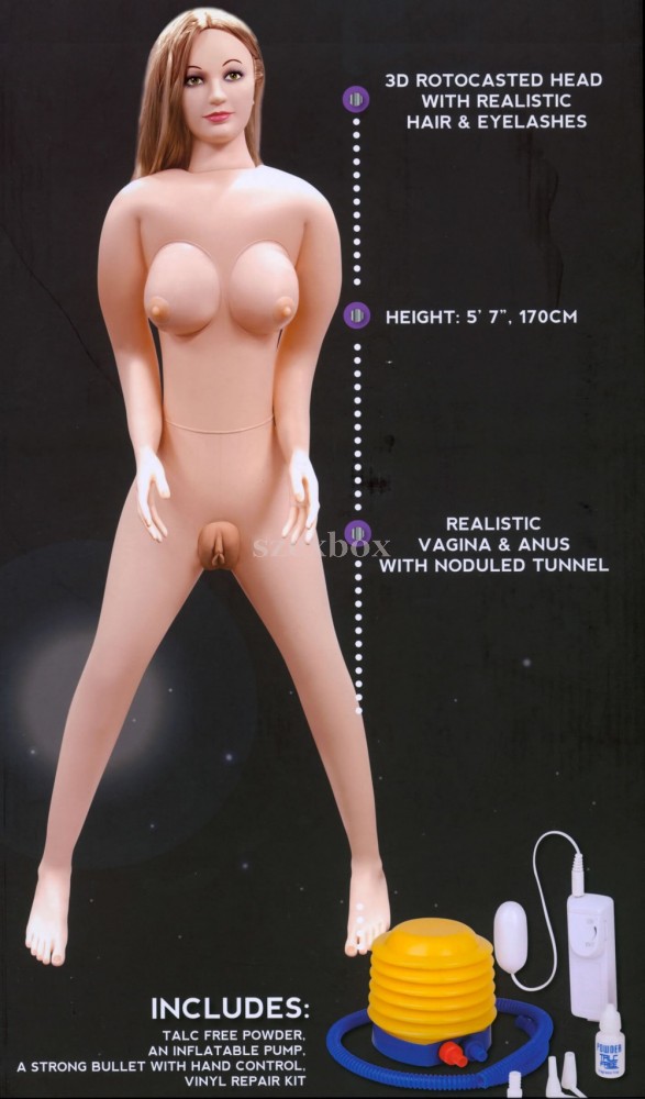 Tulajdonságok:-életnagyságúra felfújható kivitel-álló pózben, kisebb terpeszben-3D-s arc-zöld szem-fésülhető, hosszú, szőke haj-telt keblek-izgalmi állapotú mellbimbók-fehér bőr-élethű anyagú, belül bordázott, kivehető kéjbarlang (vagina, ánusz)-formált 3D-s kéz- és lábfej-festett körmök-igéző szempillák-teljes hossz: 170cm-mellékelt vibrációs tojással-a tojás hossza: 5,5cm, átmérője: 2cm-vezetékes távirányítóval, fokozatmentes rezgésszabályozássalAnyaga: PVC (baba-test), TPR (vagina, ánusz), ABS (tojás).A vibrációs tojás 2 db ceruzaelemmel (2 x AA) működik, amit kérünk külön rendelj meg.A csomag ápolópúdert és lábpumpát is tartalmaz