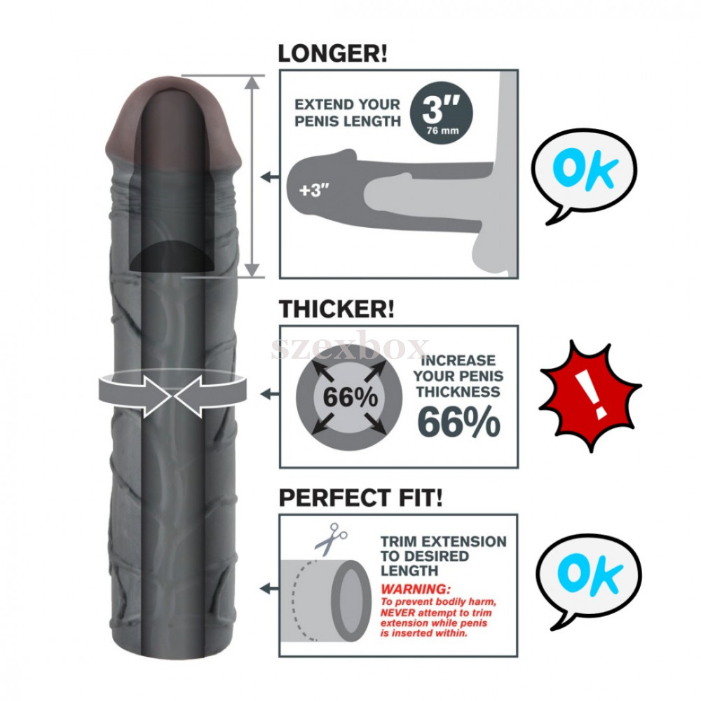 X-TENSION Mega 3 - élethű péniszköpeny (22,8cm) - feketeÉlethű anyagú péniszfeltét, mely fájdalommentesen növeli a pénisz méretét, hogy egy igazi Csődörré változhass!66%-kal markánsabb átmérő és 7,6m-rel hosszabb hímtag!Miért jó?