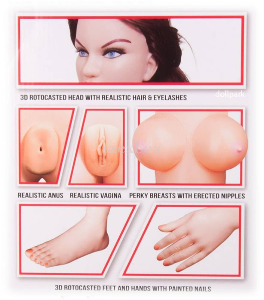 Életnagyságúra felfújható, formált, 3D arccal készült, hosszú barna hajú szexbaba, felhúzott térdekkel, széttárt lábakkal, érzéki ajkakkal, fehér fogakkal, kék szemekkel, telt keblekkel, hetyke mellbimbókkal, festett körmökkel és 3D kéz- és lábfejekkel.Tökéletesen formált, maximálisan valósághű anyagú, rugalmas, selymes vaginával és ánusszal, mely ki- és behelyezhető a babába, külön maszturbátorként is használható.Extra ráadás szilárd, kiváló rezgésvezető anyagból készült vibrációs tojással, melynek rezgéserőssége vezetékes távirányítóval, fokozatmentesen állítható.